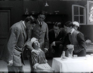 At the Cinema Ritrovato in Bologna in June of this year, I was watching Tih Minh again, and I noticed another tactic Feuillade employs as part of his overall balancing-and-symmetry approach to composition. When several characters gather in the frame, their heads are commonly arranged more or less along a horizontal line—the isocephaly spoken of by art historians, particularly in Renaissance painting. But in Tih Minh, often the story requires one character to be sitting in a chair or on a couch while others bend over him or her—out of curiosity, solicitude, or whatever. How to arrange these heads?