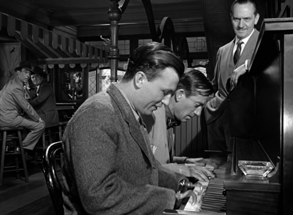 This scene is set in a bar. Fredric March has just convinced [Dana] Andrews to break off with his daughter and urges him to call her immediately. Andrews gets up and goes toward the telephone booth located near the door, at the back of the room. March leans on a piano in the foreground and pretends to get interested in the musical exercise that the crippled sailor (Harold Russell) is learning to play with his hooks. The camera’s field of view shows the keyboard of the piano dominating the foreground, March and Russell in the middle distance, the whole barroom around them, and, quite distinctly, Andrews in the far distance, tiny in a telephone booth. This shot is clearly built upon two dramatic poles and three characters. The action in the foreground is secondary, although interesting and unusual enough to demand our keen attention, since it occupies a privileged place in the composition. Yet the true action, the one that constitutes at this exact moment a turning point in the story, develops almost secretly in a tiny rectangle at the back of the room—in the left corner of the screen. 6