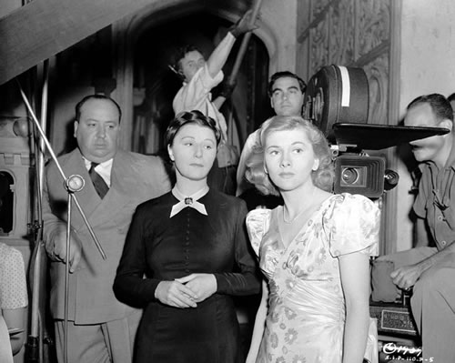 Hitchcock, Judith Anderson, and Joan Fontaine on the set of Rebecca.